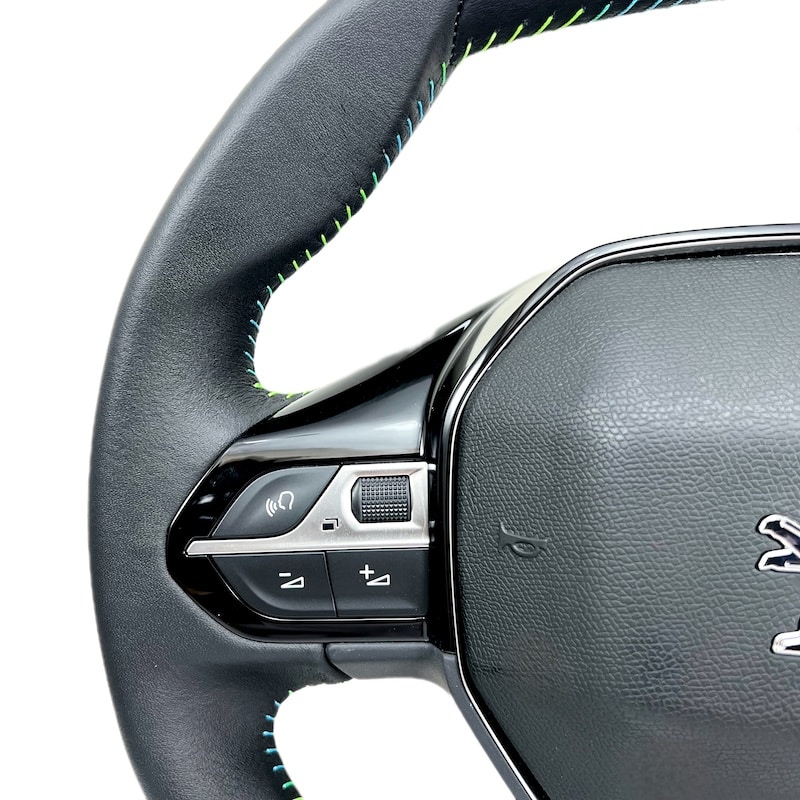فرمان پژو ۳۰۰۸ دوخت سبز آبی مناسب ۲۰۷ و ۲۰۶ از سری فرمان های۳۰۰۸ و از تولیدات کارخانه های فرانسوی و قابل نصب روی انواع خودروهای پژو از جمله ۲۰۶،۲۰۷،۲۰۸،۲۰۰۸،۳۰۱ میباشد داری کلیدهای مالتی مدیا فعال میباشد که جهت ارتباط با خودرو نیاز به نصاب دارد.