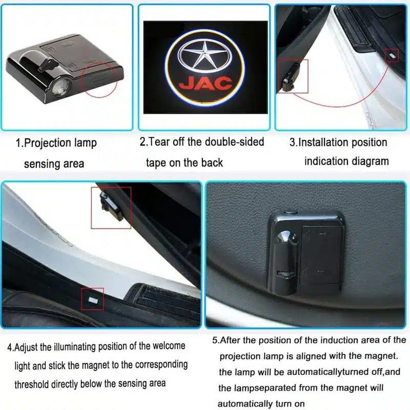 از چسب دوطرفه قوی موجود در بستهبندی استفاده کنید و ولکام لایت را روی درب خودرو در محل مناسب بچسبانید. - قرار دادن باتری و تست عملکرد