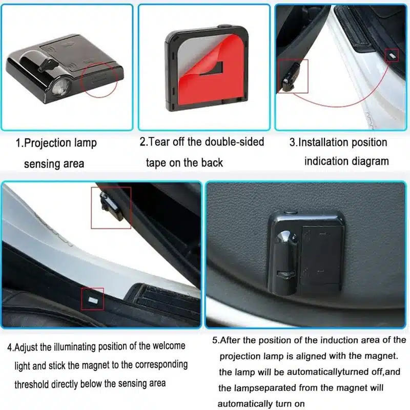 سنسور مغناطیسی را روی قسمت داخلی درب خودرو در محلی نصب کنید که هنگام بسته شدن، در مجاورت ولکام لایت قرار بگیرد. - نصب ولکام لایت با چسب دوطرفه